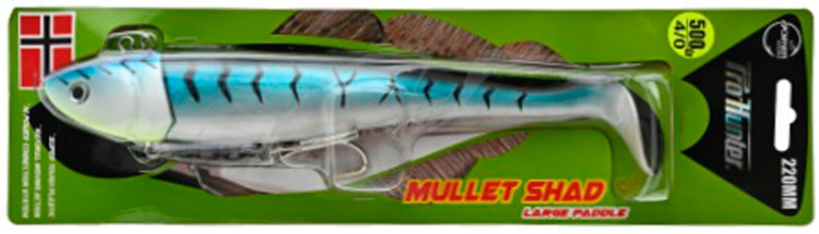 Силикон Prohunter Regular Paddle Mullet Shad – готовая огруженная приманка с груз-головкой и тройным крючком в комплекте. Рыбка имитирует кефаль, которая является широко распространенным кормовым объектом морских хищников. Предназначена преимущественно для ловли норвежского палтуса и другой морской крупной хищной рыбы. Конструкция приманки включает в себя груз-головку различной массы и расцветок, к которой при помощи двух стальных винтов прикрепляется силиконовое тело с пяткой, которое также может иметь различные расцветки и размеры. На груз-головках всех моделей имеются две петли для крепления приманки к поводку, что позволяет изменять положение ее тела и, как следствие, характер игры. Высококачественный морской тройной крючок от Owner закрепляется на груз головке через систему из вертлюжка и нескольких заводных колец. В нижней части силиконового тела вмонтирован миниатюрный магнит, на котором крючок фиксируется, до поклевки находясь компактно прижатым к приманке. Слово Regular в названии приманки означает, что силиконовое тело имеет пятку большого размера. По мере изнашивания силиконовой части приманки ее можно отдельно приобретать. Запасные силиконовые тела для Regular Paddle Mullet Shad называются Spare Body Regular Paddle Mullet Shad, они также выпускаются всех соответствующих размеров и с разнообразными расцветками.